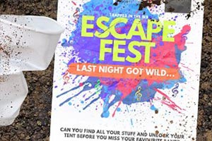 Escape Fest begins with you waking up outside your tent in the boiling midday sun following a very heady night. Memories of what happened the night before are hazy, and the challenge begins to get back inside your tent. Through a series of puzzles and audio and visual clues, players work their way round the festival ground, tracking down their missing belongings and eventually unlocking their tent.